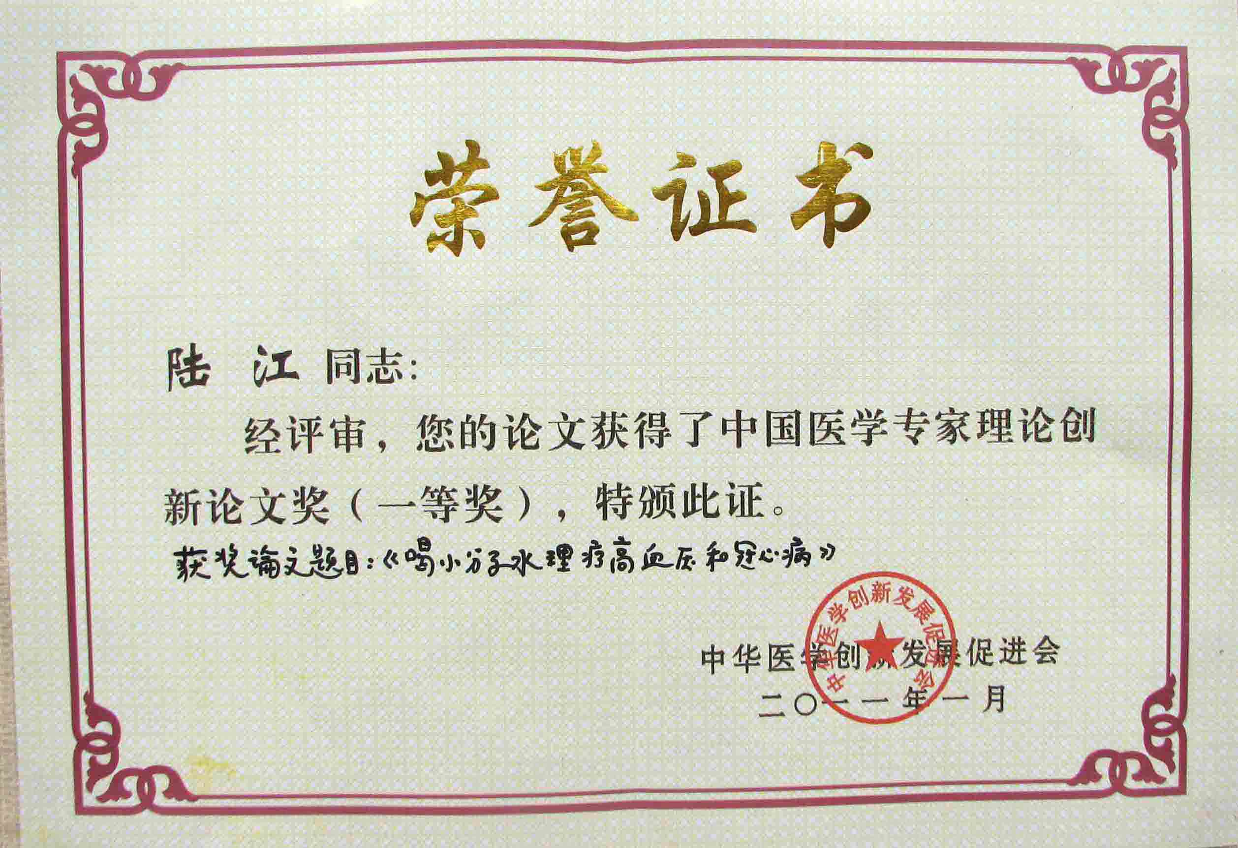 新疆63歲的賀兆生飲用一年,冠心病未愈,他用電話介紹是食堂管理員,問他食量多少?說吃七八分飽,睡前還吃兩袋牛奶,陸 江說我在論文和書中多次批判“吃七八分飽”,關照患者務必用“己饑方食”控制主食肉食量,要他把牛奶改在早中餐吃,減少主食肉食量,建議不吃晩餐,晚上只吃一個蘋果,再經(jīng)幾個月補水節(jié)食,治愈了21年的冠心病和肥胖、失眠等病,信中由衷地感激陸 江為再生父母。[13]因為醫(yī)生從未過問他的膳食習慣,只管開處方藥或手術(shù),父母也不會叫他不吃晩飯。